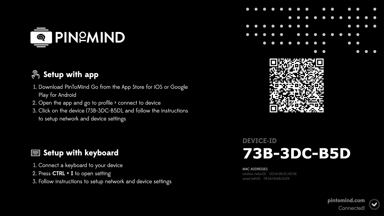 2. When the device is ready, the screen shown below will appear, and you can either use the PinToMind Go app or a keyboard to set up the device. (The links will take you to a separate article.)