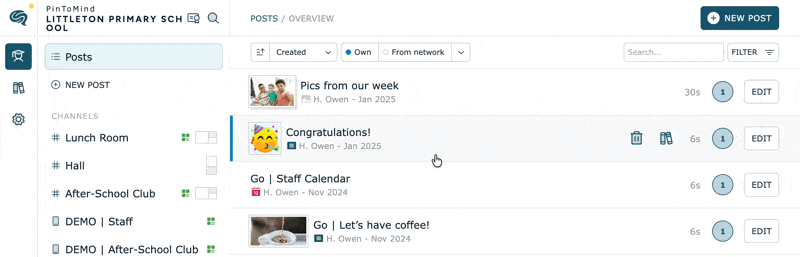 ℹ️ Selecting Posts in the left menu bar will display all the posts that are saved on your account. There you see both those posts that are displayed on a channel, and those that are not published to a channel. You can choose whether they should be sorted by date for Created, Edited, name of Title or Type of post.