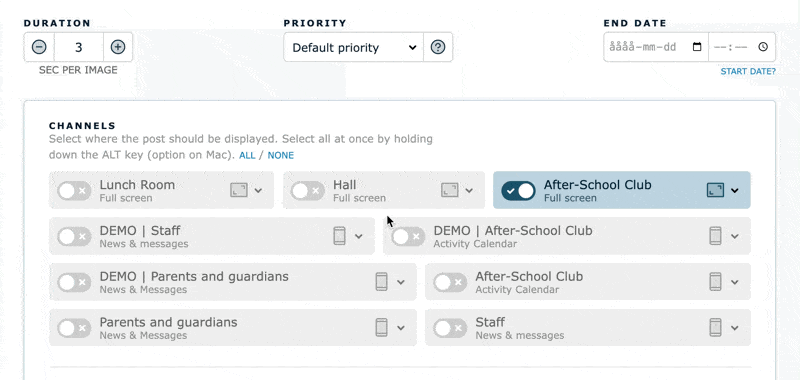 Select channel(s), and the area of the channel you want the post displayed in. You can also choose to display the post in full screen.