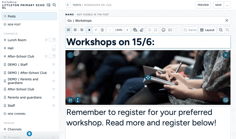 You can enter additional information in all post types, which will appear in the mobile app, but not on the screen on the wall.